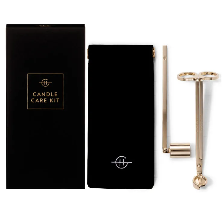 The ultimate candle care kit includes a wick trimmer to regularly trim the wicks of your favourite Glasshouse Fragrances candle and a candle snuffer to extinguish your flame and preserve the burning quality of your candle. Made entirely from stainless steel with gold plating.