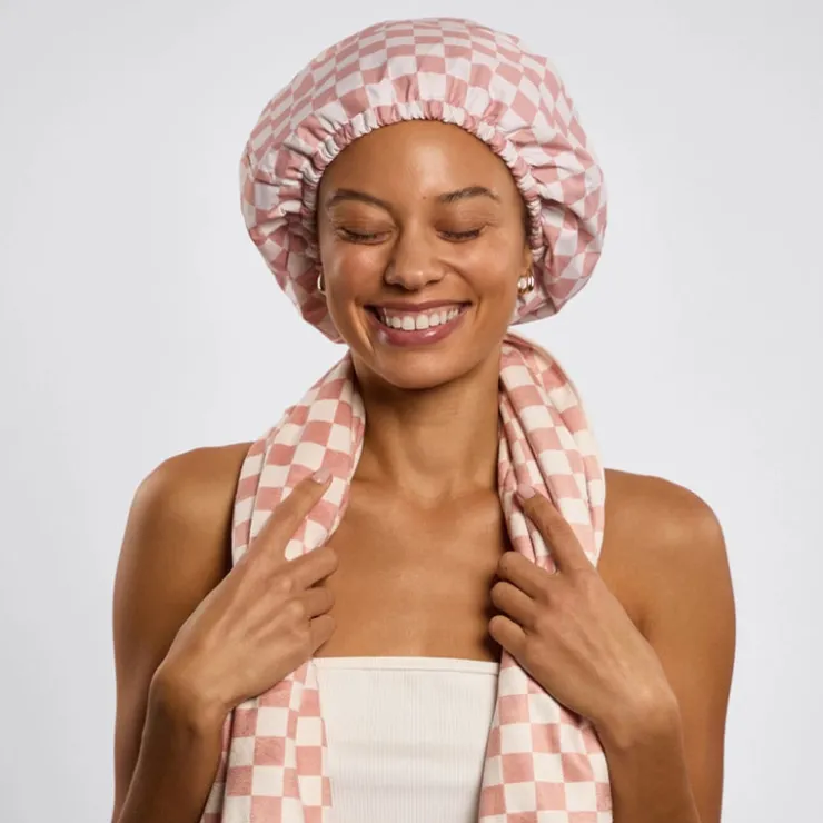 Protect and preserve your style between wash days with the oversized, waterproof and satin-lined shower cap. Cut drying time in half with the oversized towel wrap’s soft, ultra-absorbent microfiber material that helps tame frizz and reduce hair breakage