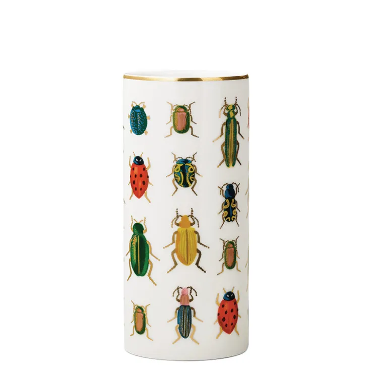 Ceramic vase printed with gold foil accents and colorful bugs and beetles.7.5″ tall x 2.5″ wide openingRifle Paper Co. i…