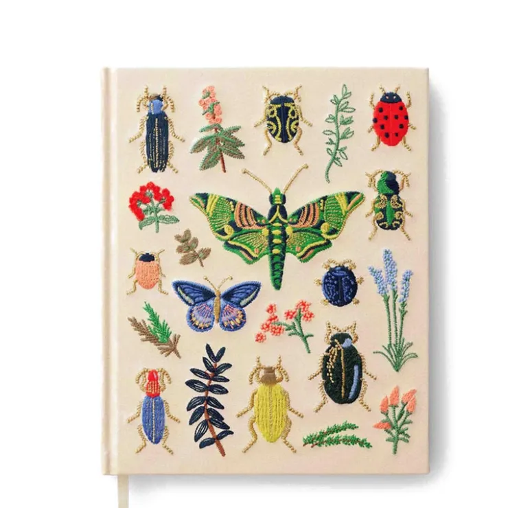 This embroidered sketchbook is a large, hardcover journal with 108 unlined pages of thick paper perfect for sketching, drawing, and journaling. The cover is wrapped in cream book cloth and embroidered with the beetles and bugs of Rifle Paper’s Curio print with metallic gold accents. An attached grosgrain ribbon bookmark will save your place.