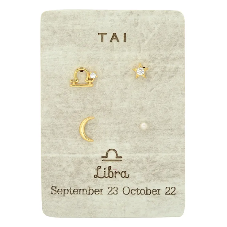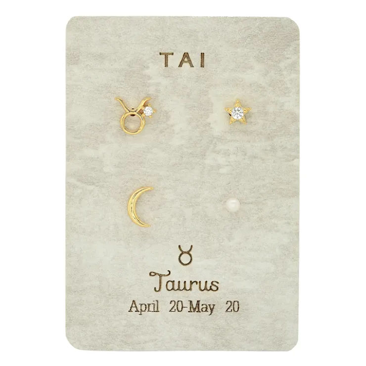 Mismatched stud pack that includes single zodiac sign stud, cz star, crescent moon and freshwater pearl studsGold plated…