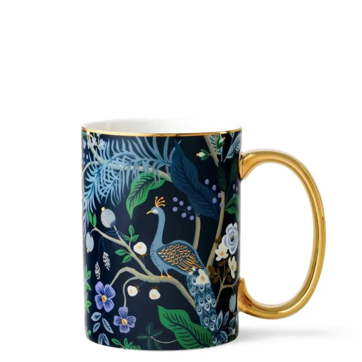 Magnificent peacocks perch on winding branches on Rifle Paper’s Peacock mug, with gold accents that shine against a deep, midnight blue. Rifle Paper Co. porcelain mugs feature illustrated designs and a gilded rim and handle to add a little something special to your favorite beverage.