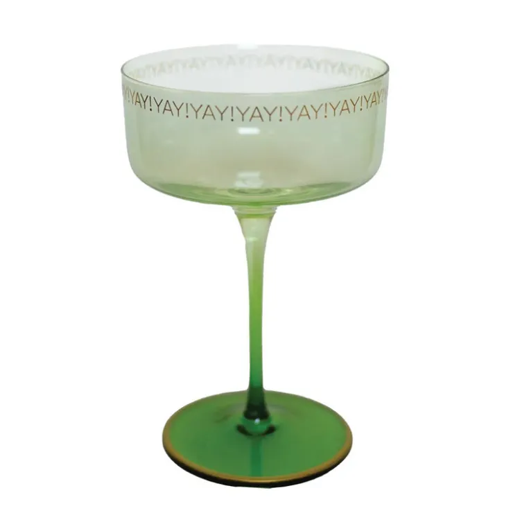 11 oz colorful lead-free crystal coupe glass. Hand wash only. Gold inscription repeated around rim of glass reads “YAY!”