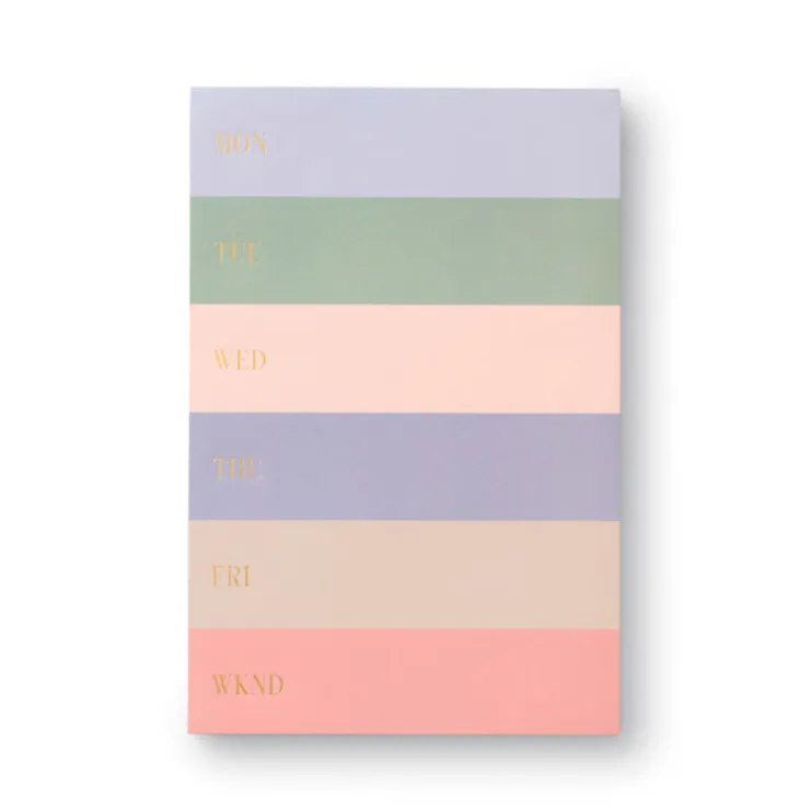 Featuring bands of soft hues separating the days, this oversize notepad makes even mundane memos look motivating. The pad features 65 tear-off sheets with gold foil on every page.