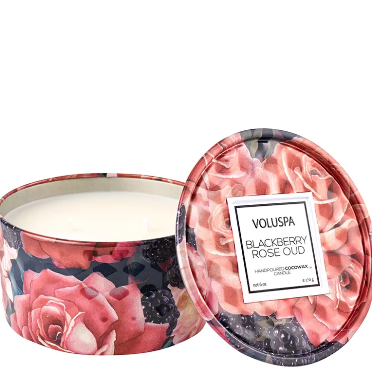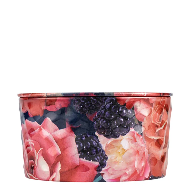 A tin candle completely embossed with a 3D geometric cube pattern and packaged to match the rose-inspired fragrance.