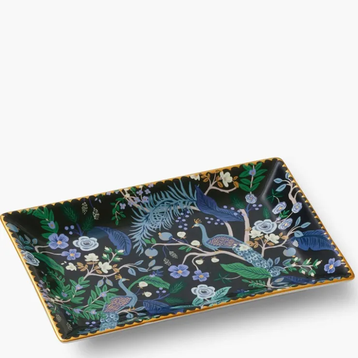 Keep track of all your trinkets with this catchall tray, perfectly sized for keys or jewelry. This porcelain dish features Rifle Paper’s Peacock print in a deep blue and has a metallic gold scalloped rim and gold accents for extra shine.