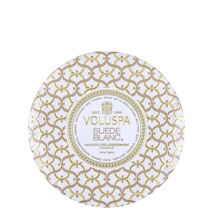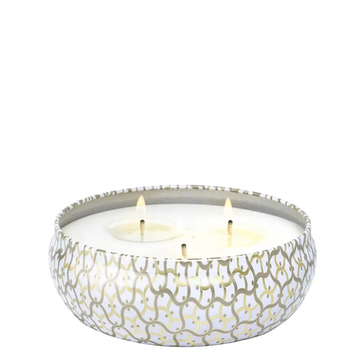 Voluspa’s iconic tin takes on a new look and feel adorned in the Maison pattern emboss. A graceful urn-shaped container featuring three wicks creates a generous melted wax pool and ample fragrance throw while burning. This 12 ounce tin makes a statement on its own, and includes a coordinating lid, which can be used to extinguish the flame.