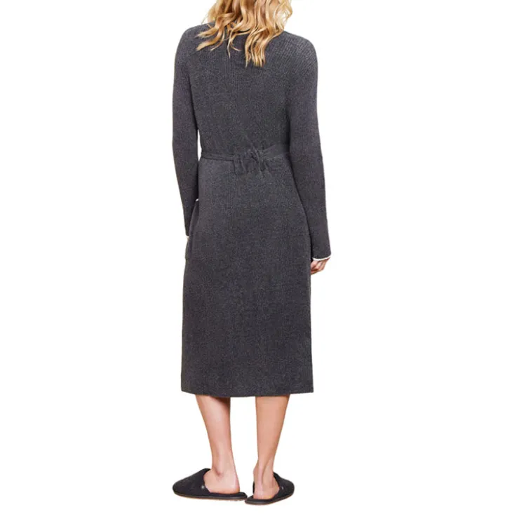Barefoot Dreams robe in ribbed CozyChic Lite® fabric with contrast trim.Surplice neckline, Wrap front, Long sleeves, Waist self-tie, Front patch pockets, Hem falls below the knee, A-line silhouette