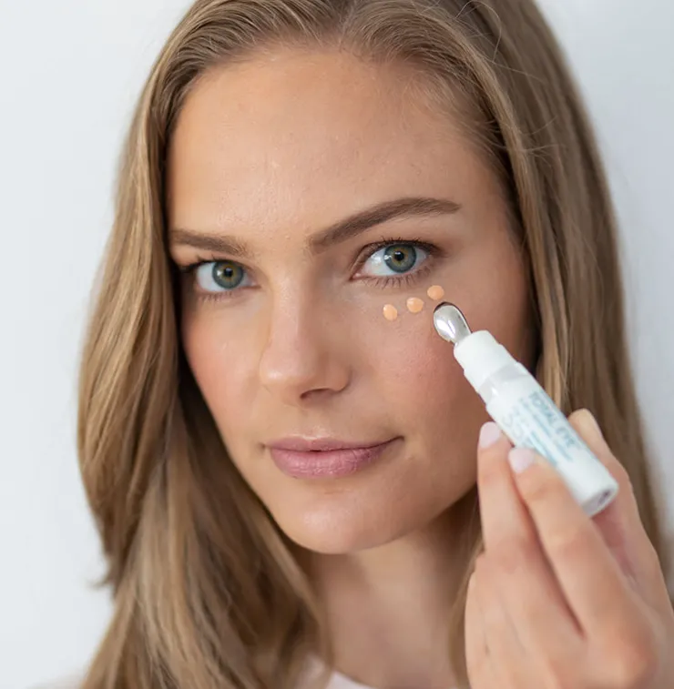 - Dispense half a pump to the applicator tip and dot around both eyes.