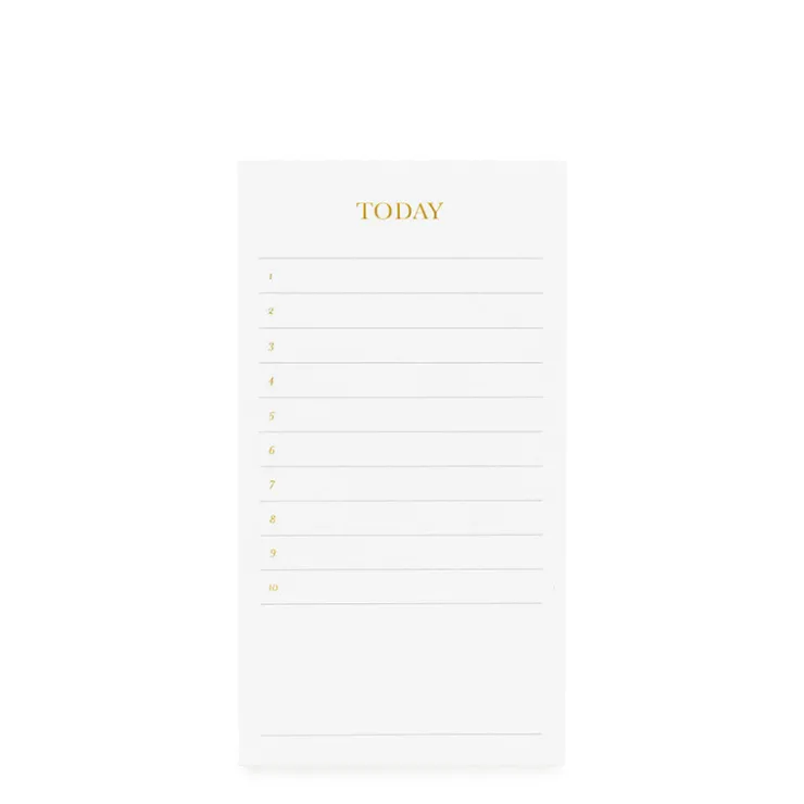 Sugar Paper’s Today Pad helps you get what needs to be done, done. 10 numbered lines followed by a blank section to fill in everything on your daily list. Grey ink is printed on crisp white paper with gold foil details.