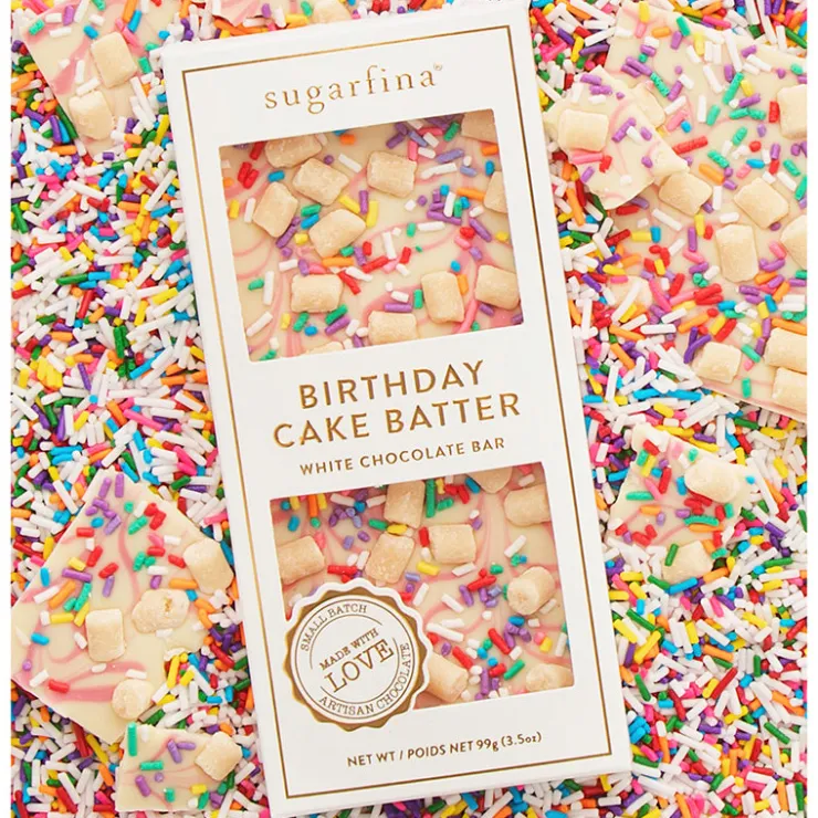 This decadent white chocolate bar is cake batter-flavored and confettied with rainbow sprinkles and rich, cake batter-fl…