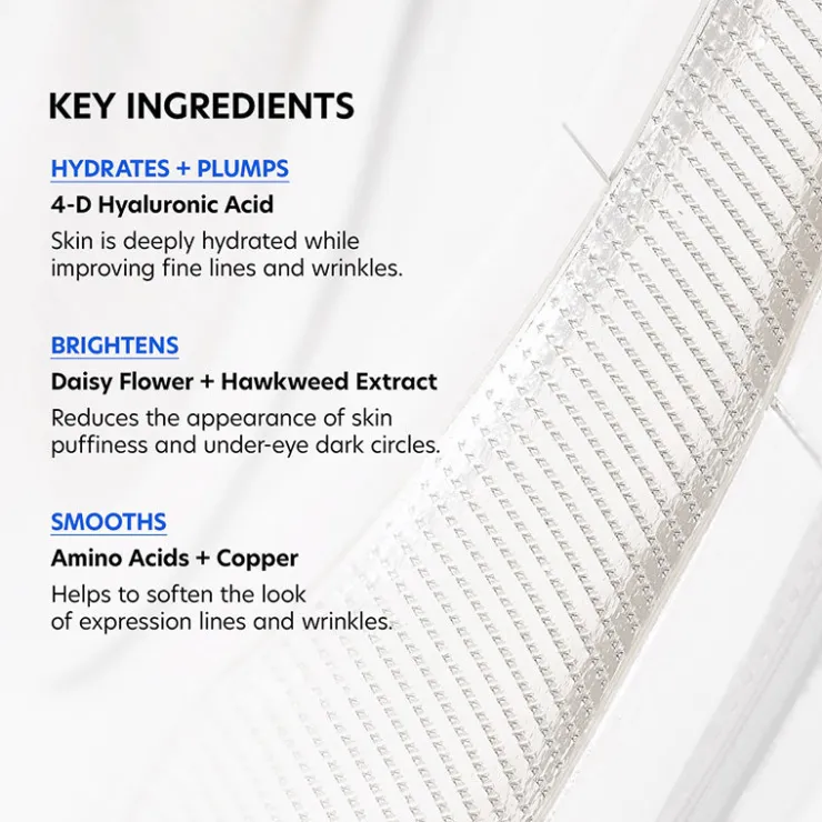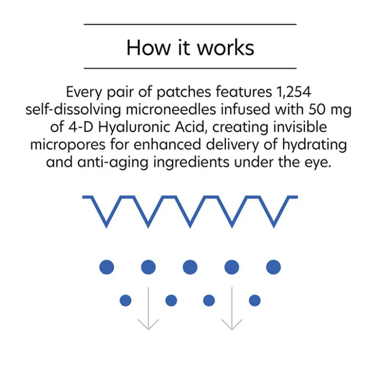 Experience enhanced hydration with the first professional grade microneedle eye patch from PCA SKINĀ®. Featuring 1,254 self-dissolving microneedles infused with 50 mg of 4-D Hyaluronic Acid that create invisible micropores for enhanced delivery of hydrating and anti-aging ingredients under the eye, resulting in a 22% reduction in wrinkles in just one treatment*. Daisy Flower and Hawkweed Extract combine to brighten dark circles and rejuvenate the skin, while amino acid and copper help to soften expression lines and wrinkles. Results are visible after one treatment.