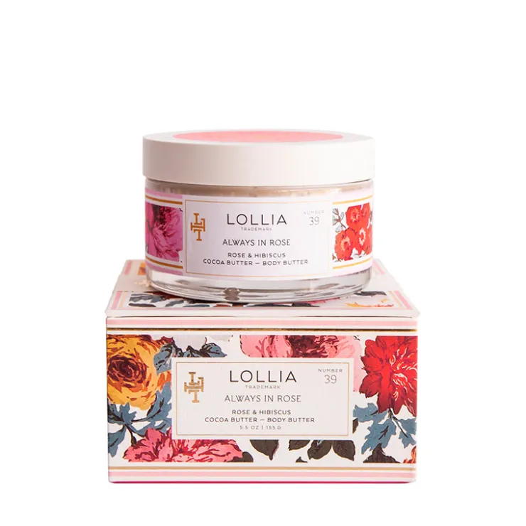 Discover moisture-rich bliss in Lollia’s Always In Rose Body Butter. Ultra-nourishing and richly comforting, Aloe and Shea Butter envelop your body in lush hydration as Cocoa Butter and Avocado Oil restore radiance. Delicate floral infusions of blushing Rose, Hibiscus & warm Amber leave skin delightfully scented.