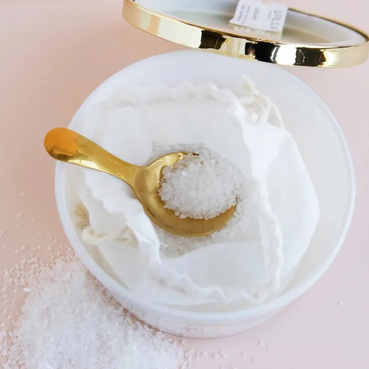 - Inside, a delicate linen drawstring bag holds the luxurious sea salt soak.