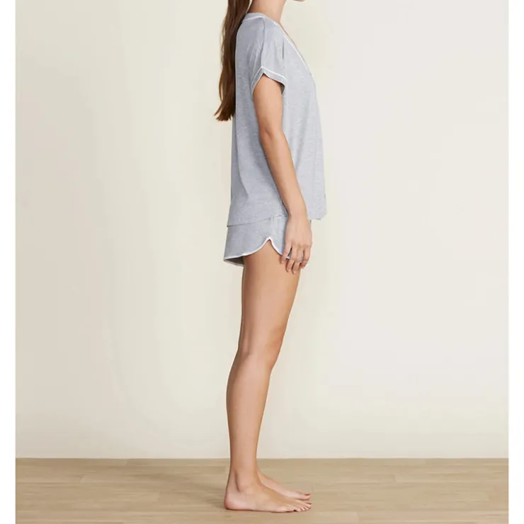 From the Barefoot Dreams Malibu Collection®, stay comfortable and stylish while lounging in our Soft Jersey Piped Lounge Set. Featuring a button-down dolman style tee with contrast piping and a patch pocket, and elasticated pull-on shorts with contrast binding at the hemline. Pairs beautifully with the Malibu Collection® Soft Jersey Piped Robe.