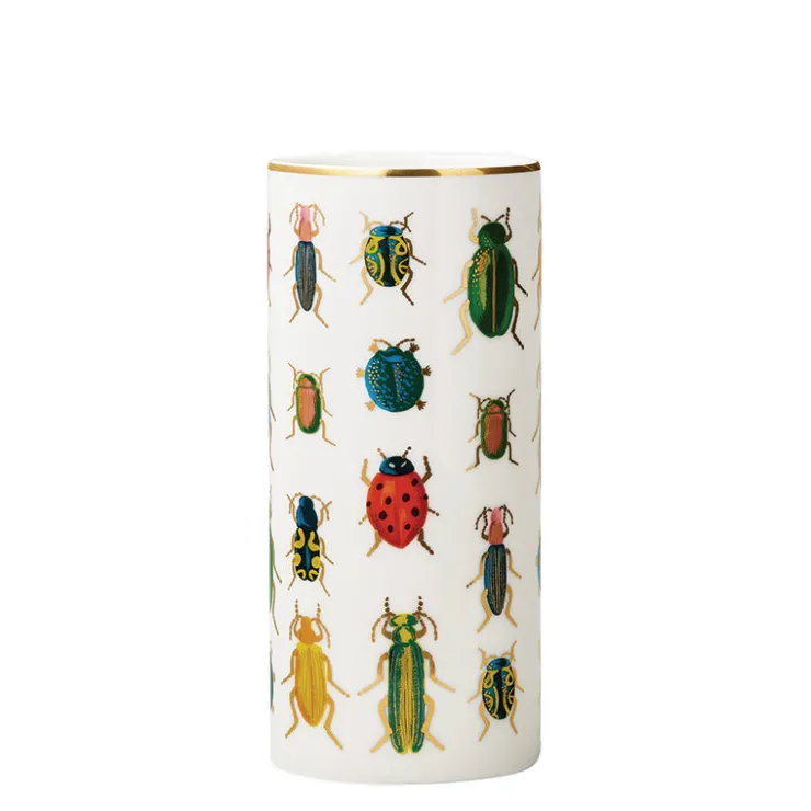 Ceramic vase printed with gold foil accents and colorful bugs and beetles.7.5″ tall x 2.5″ wide openingRifle Paper Co. i…
