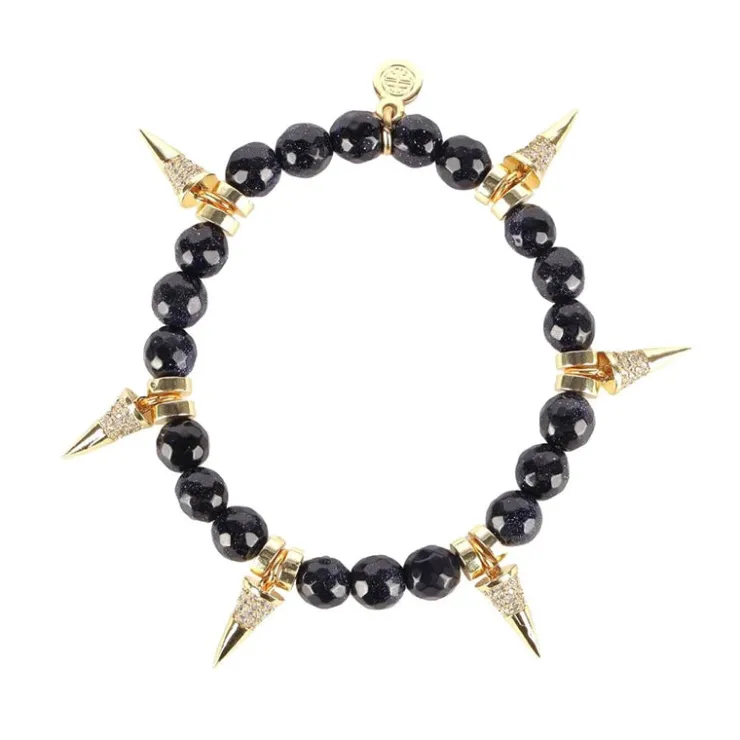The jet-set’s favorite. This little navy beauty with gold and crystal studs will keep you dancing from dawn until dusk. Faceted blue goldstone beads are home to fun-loving gold and crystal mini-studs.