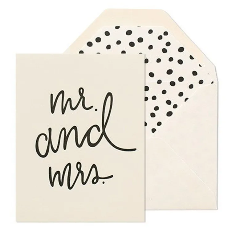 Our Playful Mr. and Mrs. card is letterpress printed by hand on antique machinery. Black ink on cream paper, paired with a cream envelope and black dalmatian liner. Folded card, blank inside.Â