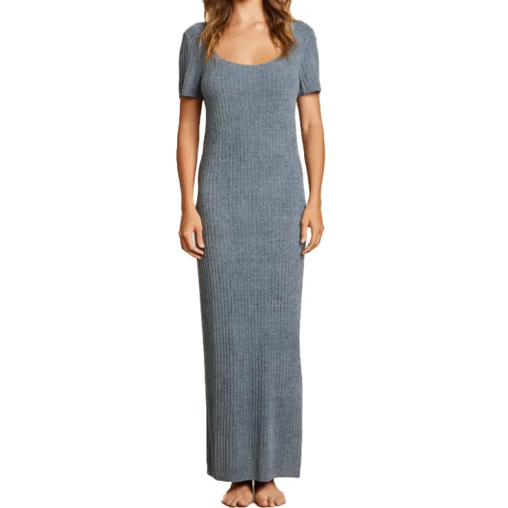 Featuring a flattering square neckline and all over rib detail, this semi-fitted midi length dress will make you feel effortlessly chic. With a side seam slit for added movement, this dress is perfect for any occasion.