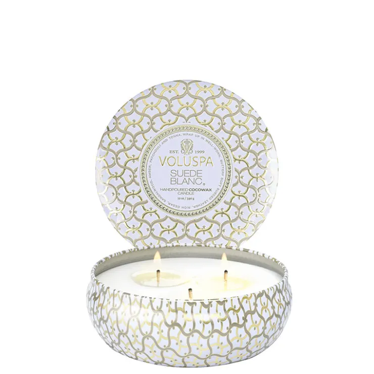 Voluspa’s iconic tin takes on a new look and feel adorned in the Maison pattern emboss. A graceful urn-shaped container featuring three wicks creates a generous melted wax pool and ample fragrance throw while burning. This 12 ounce tin makes a statement on its own, and includes a coordinating lid, which can be used to extinguish the flame.