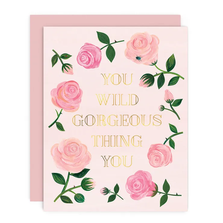 For the fiercest in the garden, wild roses set to gold foil.Single blank interior greeting card with matching rose envel…