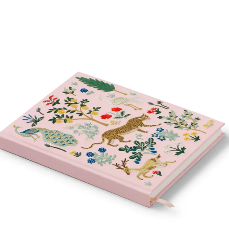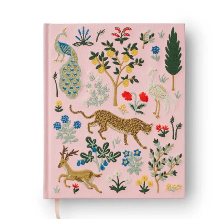 This embroidered sketchbook is a large, hardcover journal with 108 unlined pages of thick paper perfect for sketching, drawing, and journaling. The cover is wrapped in cream book cloth and embroidered with an enchanted forest scene with metallic gold accents. An attached grosgrain ribbon bookmark will save your place.