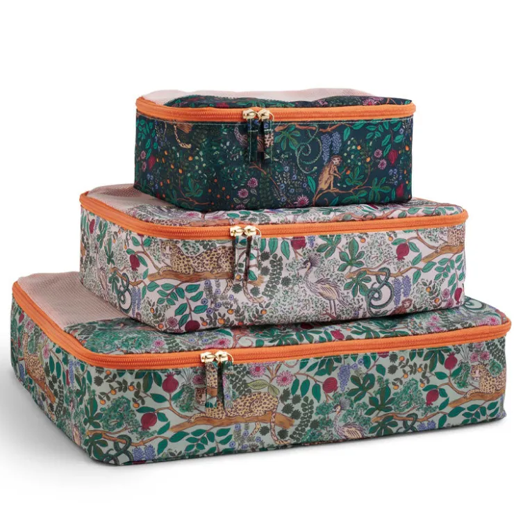 Make your packing prettier with this set of three packing cubes with zipper closures and a matching drawstring mesh laundry bag.