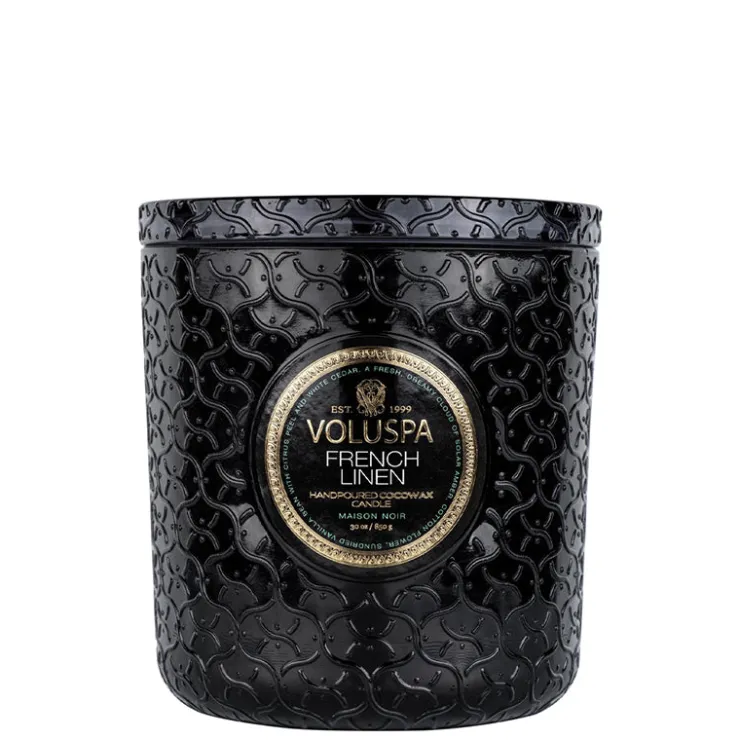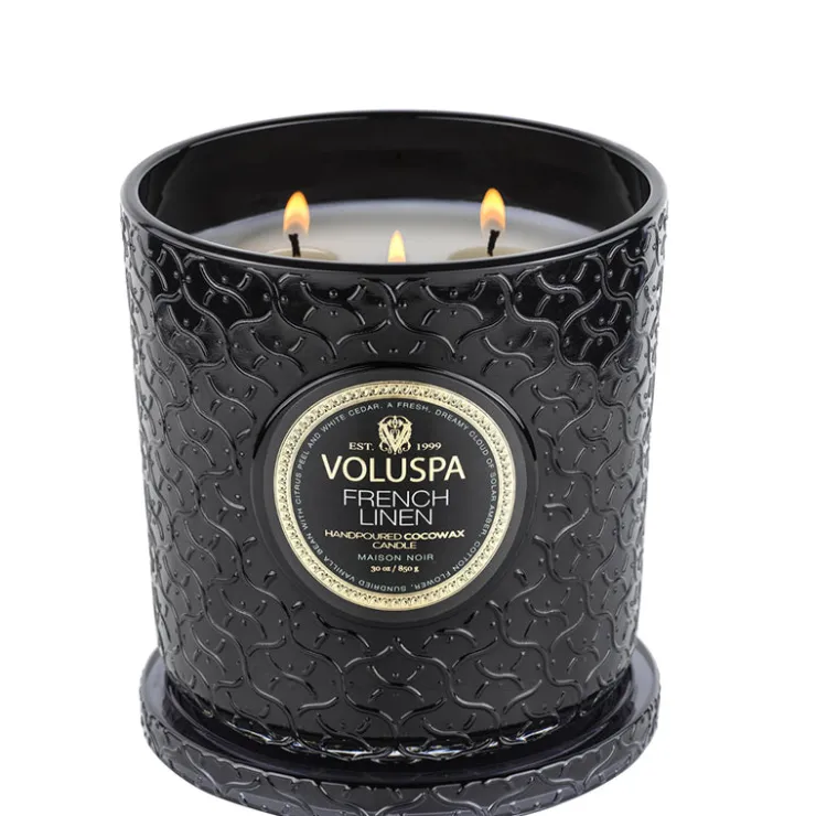 There is no shortage of luxury in our Maison Luxe Jar Candle. Voluspa’s signature Maison pattern wraps the vessel in an elegant emboss from base to lid. The triple wick configuration transforms the ambience with its reflective glow, creating a generous wax pool to ensure abundant fragrance throw. As a finishing touch, the candle is perfectly designed to fit in the depression of the lid when lit.