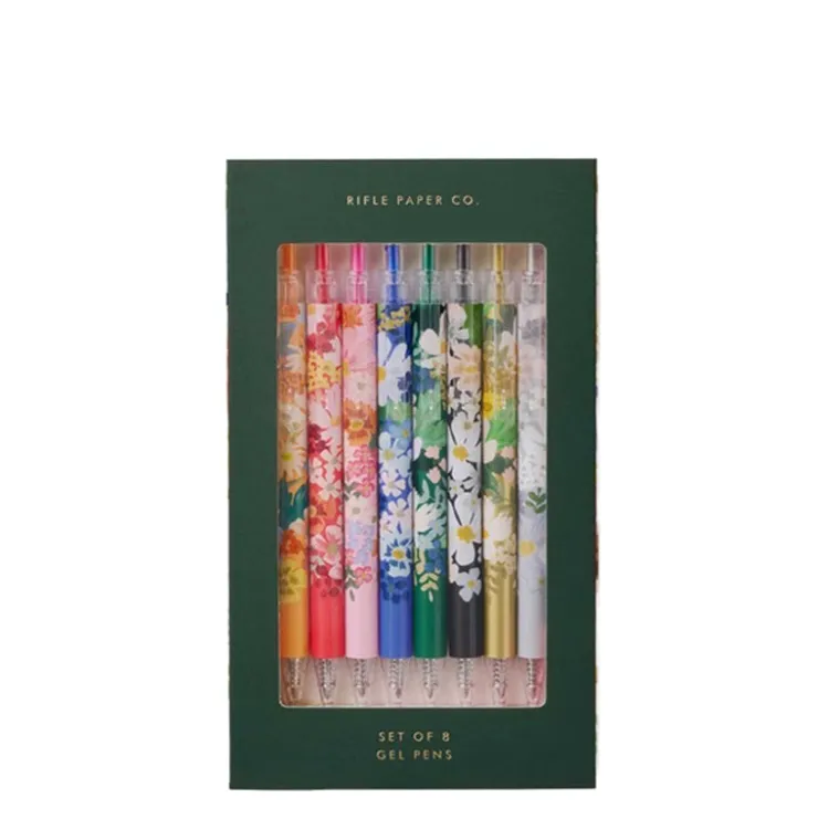 Make note-taking a whole lot brighter with this set of 8 retractable gel pens. Each pen has a different color ink with coordinating Margaux illustrations: orange, red, pink, blue, green, black, metallic gold, and metallic silver.