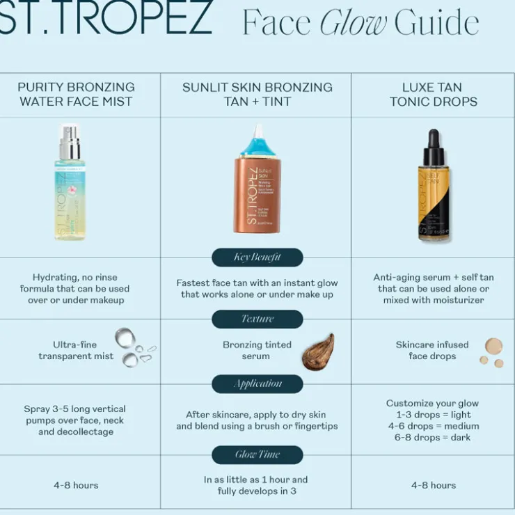 A complexion perfecting tint for an instant, bronzy glow and self tan results that last for days. A sun-kissed glow in as little as 1 hour and a medium, natural-looking tan that fully develops in 3 hours.
