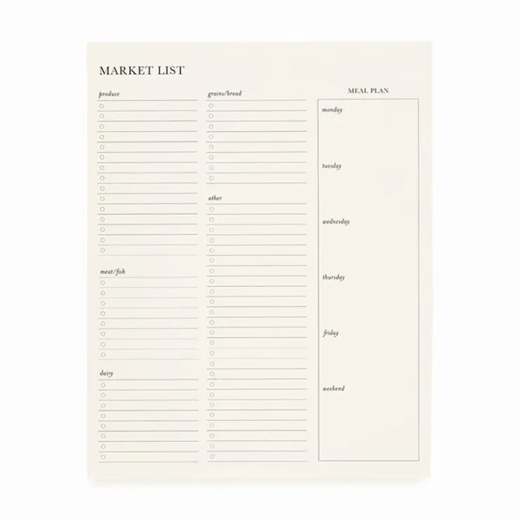 The Sugar Paper Market List was designed with your trip to the store in mind. With a meal planning section on the right and a market list on the left, you can plan your weekly trip and grab everything you need. With plenty of room for produce, dairy, main course, and bread, this list gives you additional room for all those other items you don’t want to forget. Designed by women who love to cook, this list will keep your weekly meals on track.