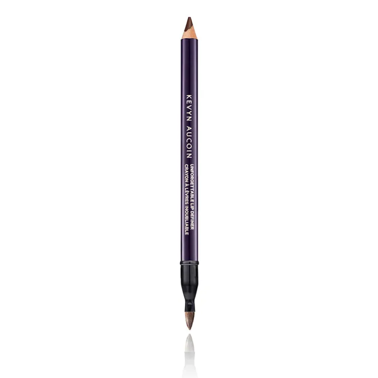 A long-wearing, water-resistant lip liner that maintains a defined tip, includes a separate sharpener and attached brush for precise application and artistry techniques at home.