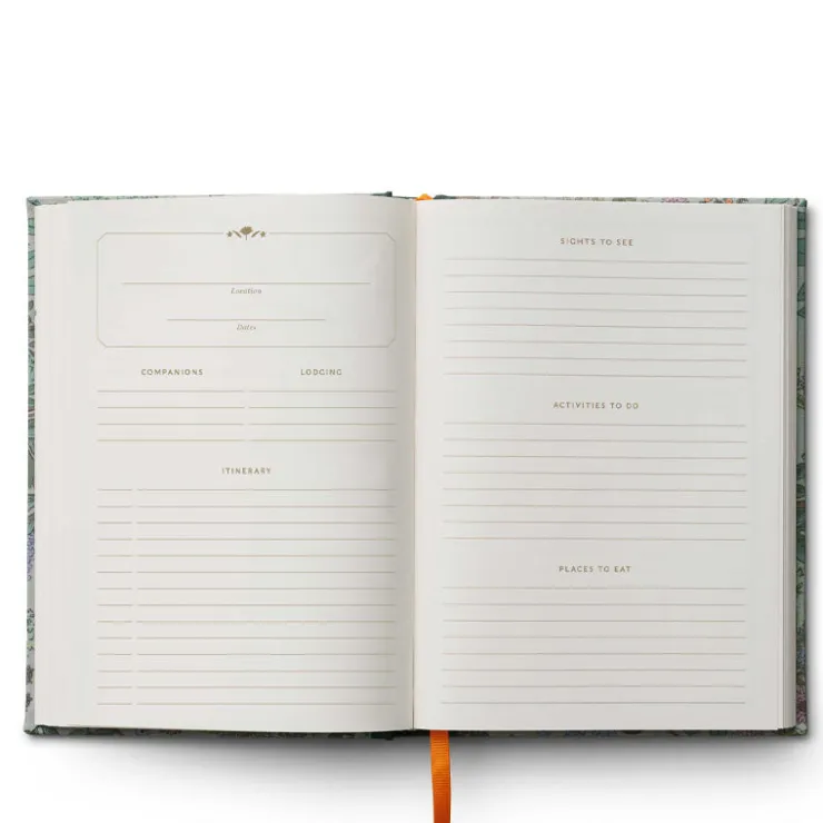 A guided hardcover journal wrapped in bookcloth featuring an illustrated print inspired by old world travel. Inside find sections for dream travel destinations, sights to see, activities to do, places to eat, hotels to visit, and travel log pages, plus a grosgrain ribbon bookmark.