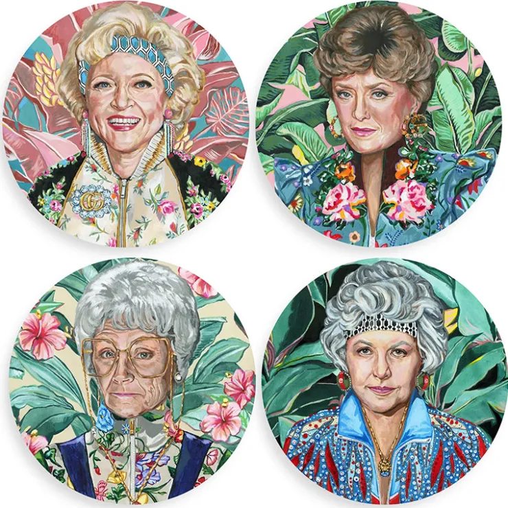 Thank you for being a friend! Your favorite group of ladies is now your favorite coaster set. Artwork is by “Drunk Girl Designs” artist, Heather Perry and features the Golden Gals in their best 80’s workout wear.