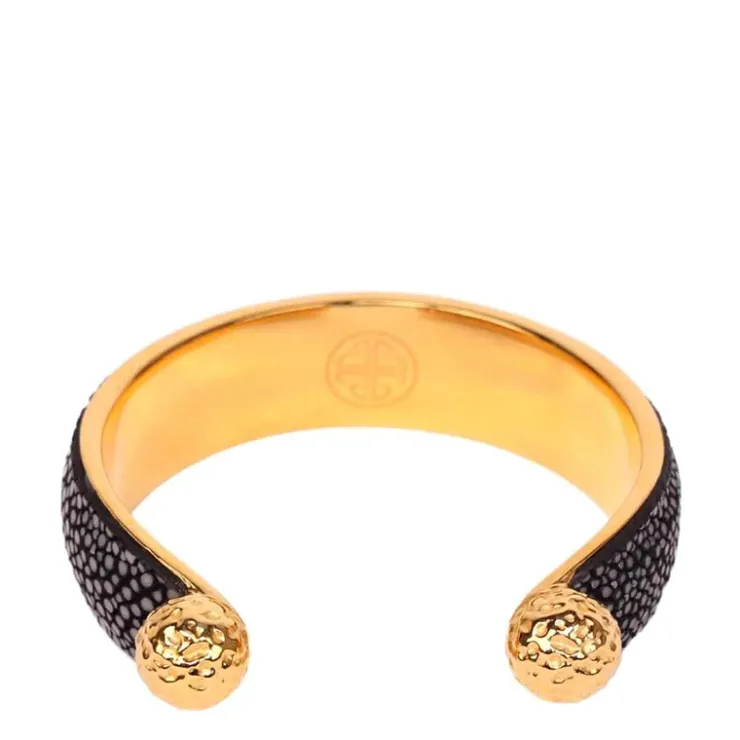 Fabulous crescent-shaped gold-dipped brass is forged into a cuff and finished with glamorous sunflower-heart inspired globes. It is perfect matched with All Weather Bandles and flexible enough to fit almost any wrist comfortably.