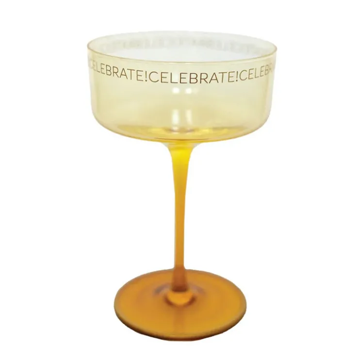 11 oz colorful lead-free crystal coupe glass. Hand wash only. Gold inscription repeated around rim of glass reads “CELEBRATE!”