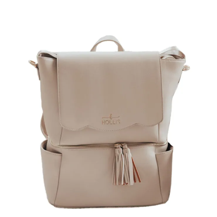 This chic and aesthetically pleasing design is made with premium faux leather and lined with a water resistant liner making spills and messes easy to clean! This fully functional diaper bag has a place for all your baby’s needs.