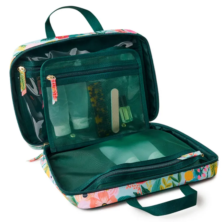 A cosmetic case with a lay-flat design, zip-around closure, pockets for storage, and a removable clear pouch. Sturdy, easy to clean nylon material makes it ideal for travel.